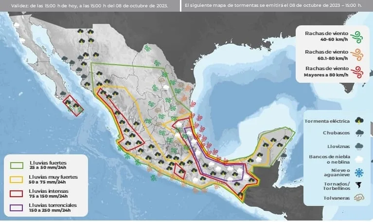 Para este domingo 8 de octubre, el organismo de la Comisión Nacional del Agua (Conagua), prevé que en el estado de Colima se puedan alcanzar temperaturas máximas de hasta 40 grados Celsius, al igual que en Jalisco, Michoacán, Guerrero, Oaxaca, Chiapas, Baja California, Baja California Sur, Sonora, Sinaloa, Nayarit, Tabasco, Campeche, Yucatán y Quintana Roo.