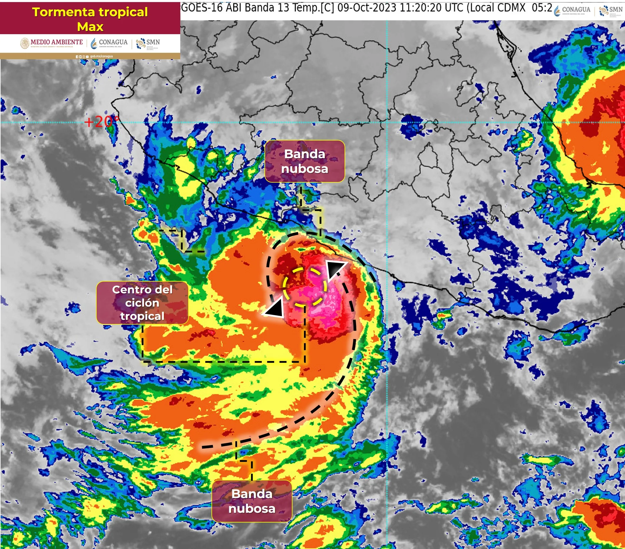 El centro de la tormenta tropical Max se localiza al sur-sureste de Zihuatanejo, Gro., y se desplaza hacia el norte; su amplia circulación ocasiona lluvias intensas con puntuales torrenciales, rachas de viento y oleaje elevado en costas del Pacífico Sur y occidente de México.