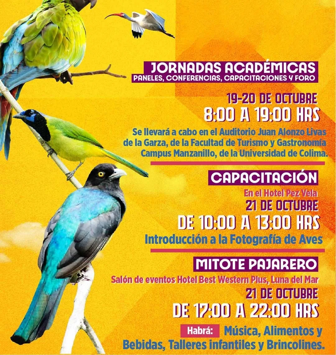 Del jueves 19 al sábado 21 de octubre, Manzanillo se convertirá en el epicentro de la observación de aves en México, con el Festival ‘Colima Birding’, evento que significa una experiencia inolvidable para amantes de la naturaleza y familias que descubrirán la belleza natural y variedad de aves en el estado de Colima.