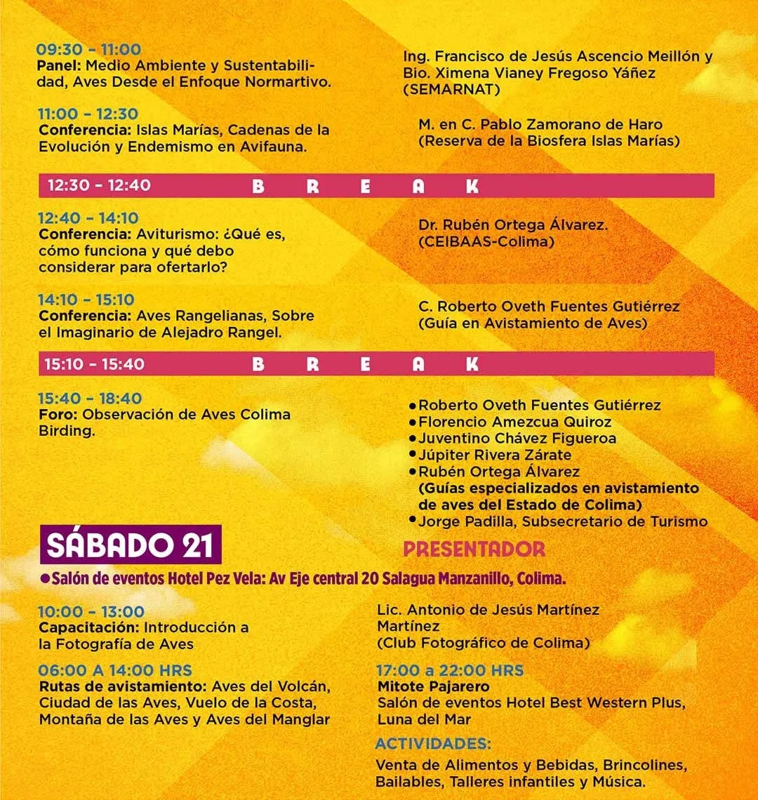 El Festival ‘Colima Birding’ es una oportunidad única para apreciar la belleza de las aves, aprender sobre su importancia en la ecología y unirse a la causa de su conservación. El Gobierno del Estado de Colima, a través de la Subsecretaría de Turismo (Subsectur) invita a toda la población a este emocionante viaje por el mundo de las aves en Colima. Para mayor información, así como registro a conferencias y tours visita: https://visitacolima.mx/eventos-colima/colima-birding-2023 .