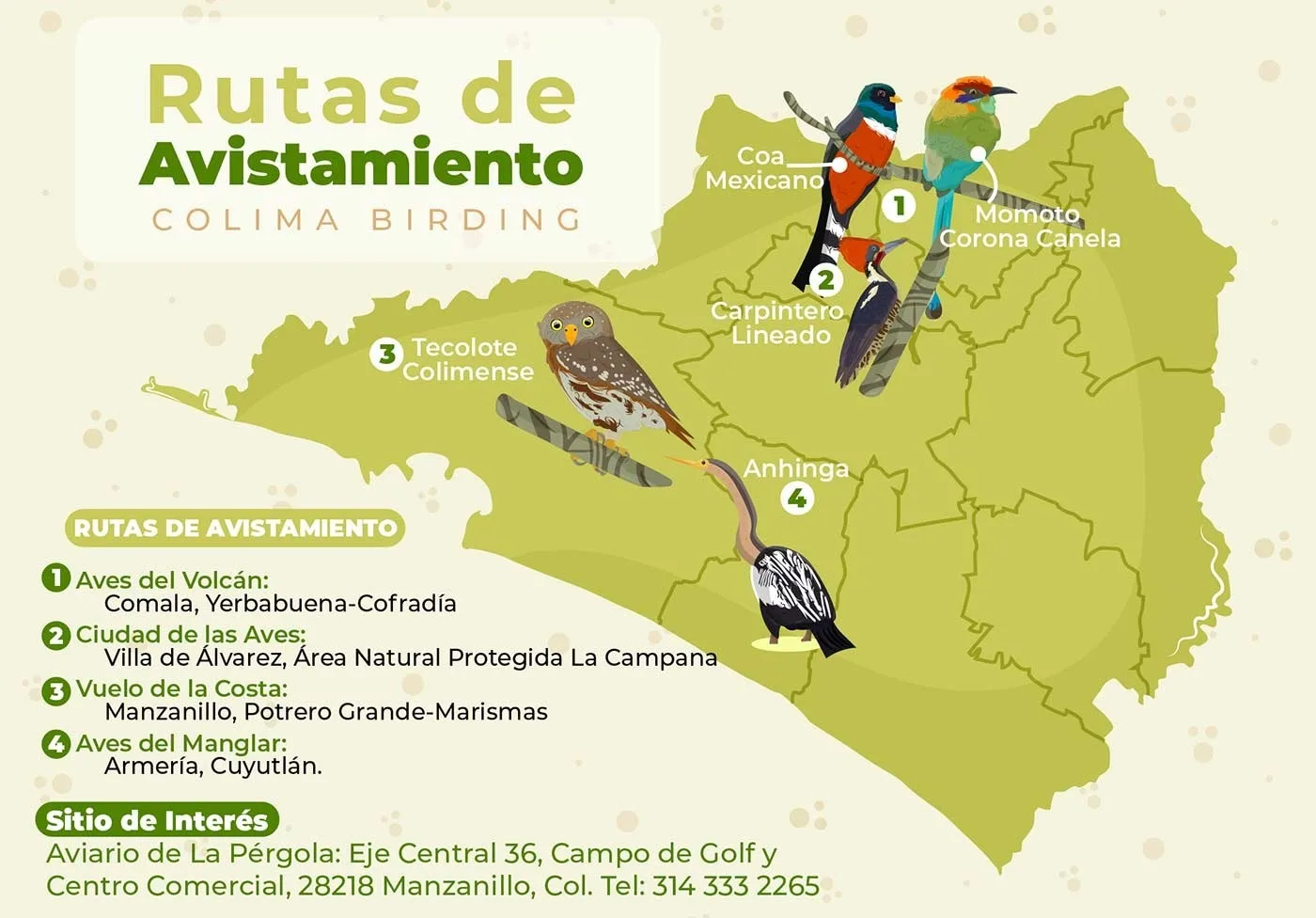 Montañas de las Aves: permite adentrarse en los municipios de Minatitlán y Comala para descubrir las aves que habitan en las zonas montañosas de Colima.