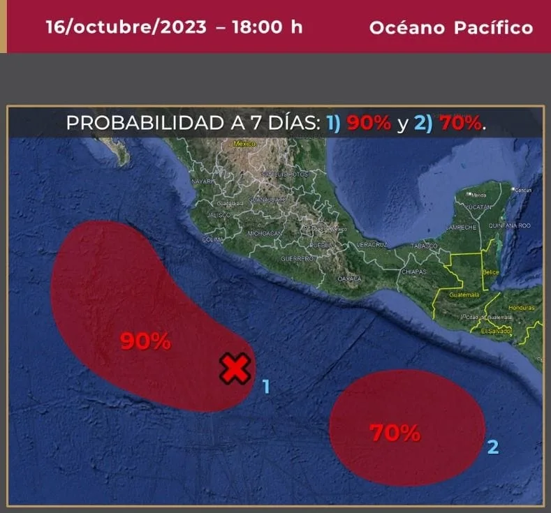 El Servicio Meteorológico Nacional (SMN) indicó que, para este martes, la zona de baja presión con alta probabilidad de desarrollo ciclónico o posible ciclón tropical se localizará al sur de las costas de Colima y Jalisco, sus desprendimientos nubosos incrementarán la probabilidad de lluvias puntuales fuertes a muy fuertes en el occidente y sur del país, con puntuales intensas de hasta 150 milímetros en Colima, sur de Jalisco, Michoacán y Guerrero.