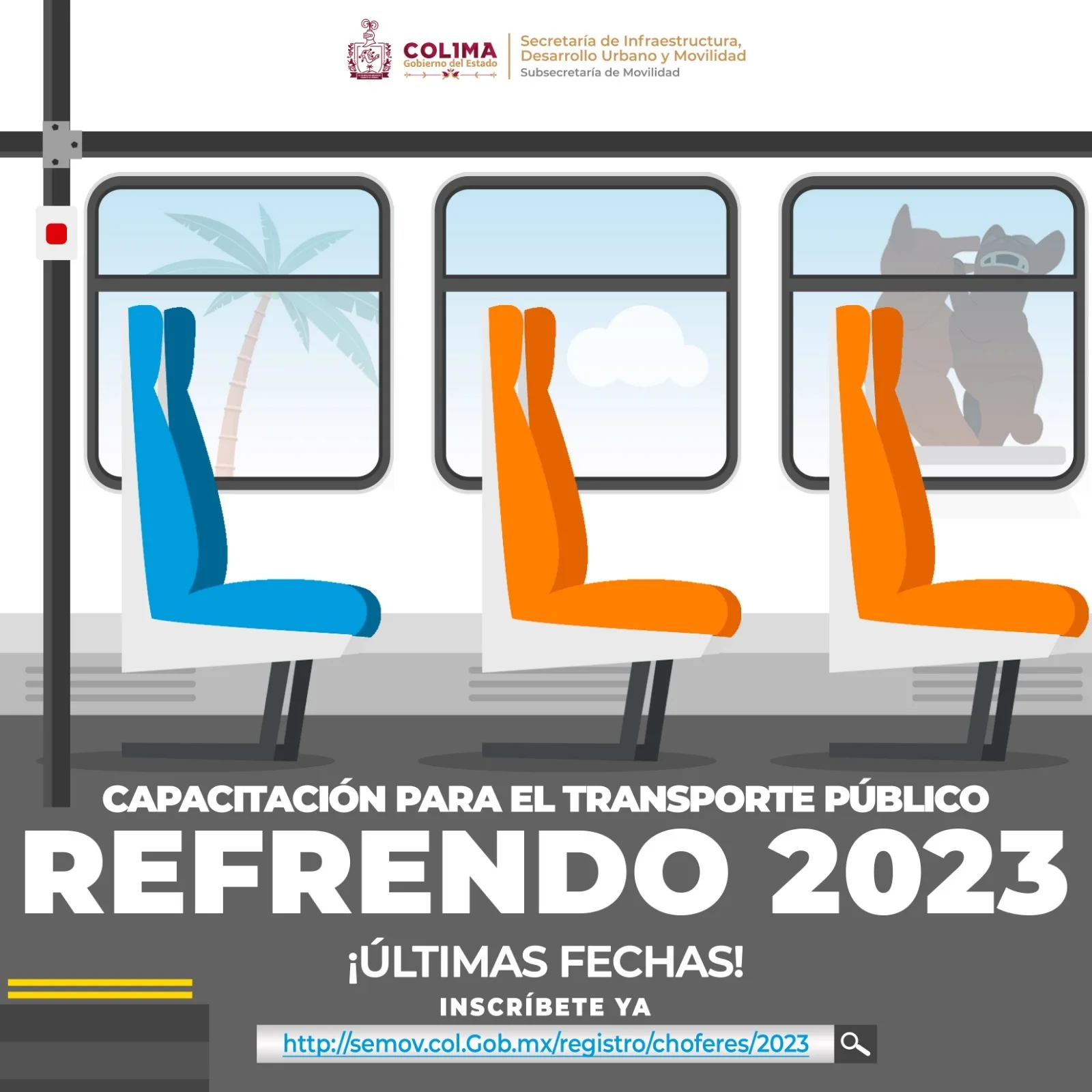 El Gobierno del Estado de Colima, a través de la Subsecretaría de Movilidad (Subsemov), hace un llamado urgente a todas las personas conductoras de transporte público individual y colectivo para realizar la última capacitación del presente año 2023; este refrendo es un trámite obligatorio para todas y todos los conductores, y es crucial para garantizar la seguridad y calidad del servicio.