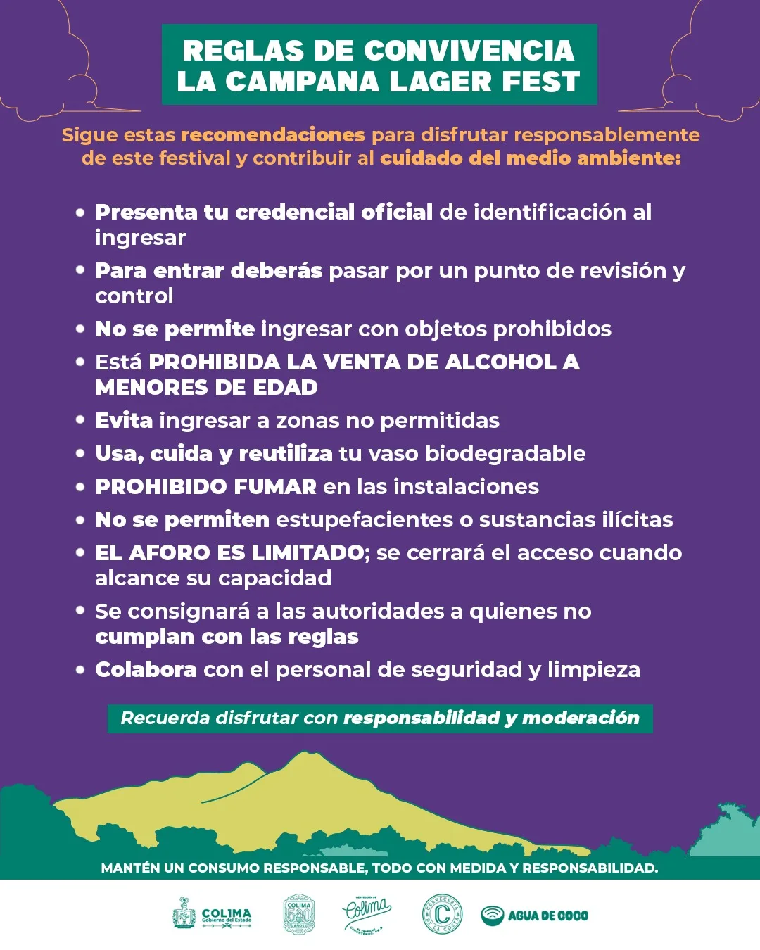 En el evento ‘La Campana Lager Fest’ que se efectuará este viernes 17 y sábado 18 de noviembre en el Parque Ecológico La Campana, la corresponsabilidad de las y los asistentes, y el respeto que muestren a las reglas de convivencia que se han establecido, serán fundamentales para contribuir a la protección de la riqueza natural y arqueológica de este sitio en la zona conurbada de Colima y Villa de Álvarez.