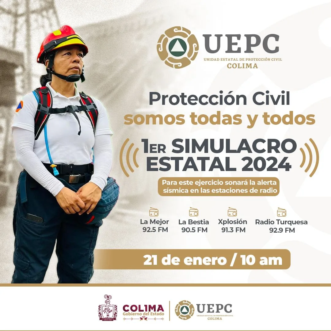 Para el simulacro del domingo 21 de enero, la alerta sísmica con la que cuenta el estado de Colima instalada en cuatro estaciones radiofónicas (La Mejor 92.5 FM, La Bestia 90.5 FM, Xplosión 91.3 FM y Radio Turquesa 92.9 FM) se activará en punto de las 10 de la mañana, por lo que se solicita a la población mantener la calma y efectuar de manera ordenada el ejercicio preventivo.