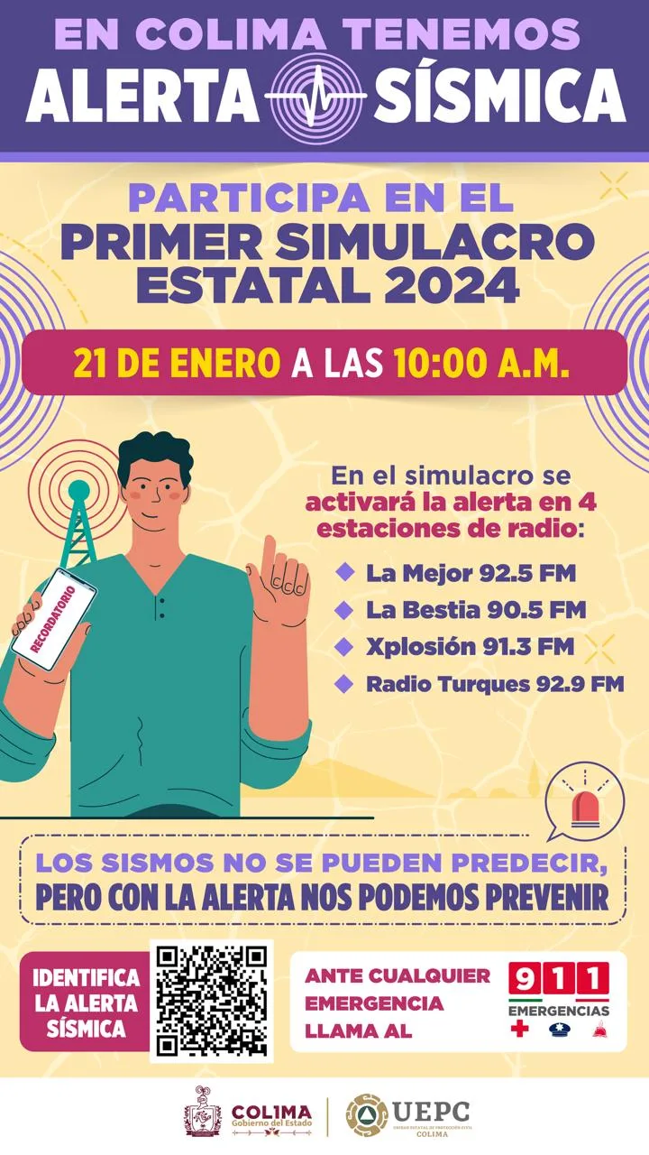 Así mismo, el titular de PC Estatal recordó que para el simulacro del domingo 21 de enero, la alerta sísmica con la que cuenta el estado de Colima instalada en cuatro estaciones radiofónicas (La Mejor 92.5 FM, La Bestia 90.5 FM, Xplosión 91.3 FM y Radio Turquesa 92.9 FM), se activará en punto de las 10 de la mañana, por lo que se solicita a la población mantener la calma y efectuar de manera ordenada el ejercicio preventivo.